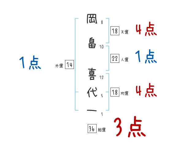 人運![]() | 岡畠喜代一さんの人運は22画の1つ星!努力することが苦手ないっぽう手先が器用。芸術性にも優れる。 性格や才能などを表す2番目に重要な運勢です。人間関係や協調性、社会的な成功に影響します。主に20歳から50歳ぐらいまでの中年期の運勢を表します。 |