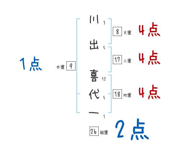 総運![]() | 川出喜代一さんの総運は26画の2つ星!波瀾万丈かも。信頼できる人を大事にしましょう。 あなたの人生を表す1番重要な運勢です。生涯を通じて影響する総合運となり、主に50歳以降の晩年期に影響を及ぼします。 |
