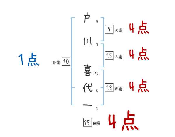 外運![]() | 戸川喜代一さんの外運は10画の1つ星!不安を感じやすい傾向。ストレスを抱えないように注意しましょう。 生活面を象徴する運勢です。外部から受ける影響力を表し、結婚運、家庭運や職場、環境への順応性を表します。 |