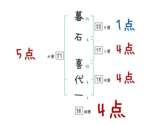外運![]() | 暮石喜代一さんの外運は21画の5つ星!統率力がある。独立し成功する。名誉を手に入れる。 生活面を象徴する運勢です。外部から受ける影響力を表し、結婚運、家庭運や職場、環境への順応性を表します。 |
