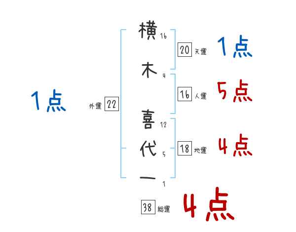 人運![]() | 横木喜代一さんの人運は16画の5つ星!人望が厚く大きく発展する。逆転成功が見える。 性格や才能などを表す2番目に重要な運勢です。人間関係や協調性、社会的な成功に影響します。主に20歳から50歳ぐらいまでの中年期の運勢を表します。 |