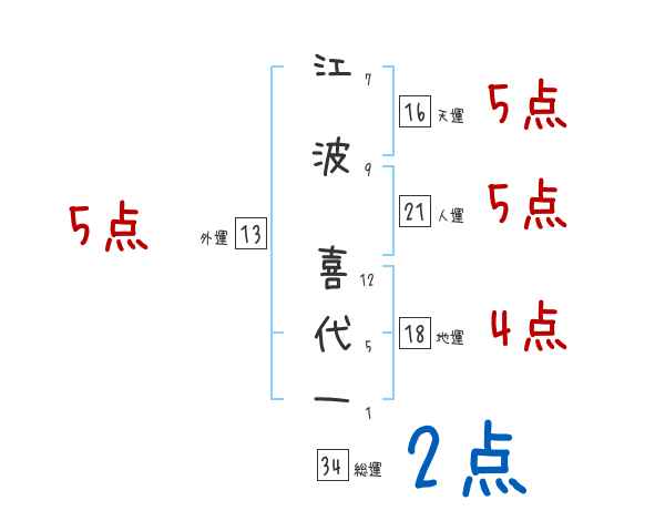 総運![]() | 江波喜代一さんの総運は34画の2つ星!独創性に優れるが、自尊心が強く災難に注意しましょう。 あなたの人生を表す1番重要な運勢です。生涯を通じて影響する総合運となり、主に50歳以降の晩年期に影響を及ぼします。 |