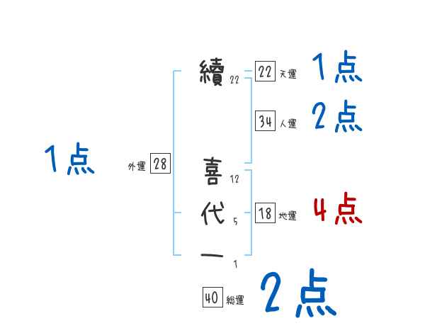 天運![]() | 續喜代一さんの天運は22画の1つ星!努力することが苦手ないっぽう手先が器用。芸術性にも優れる。 家系が持つ宿命的な運勢を表します。祖先から受け継いだ苗字ですので自分の力が及びません。家柄を象徴します。 |