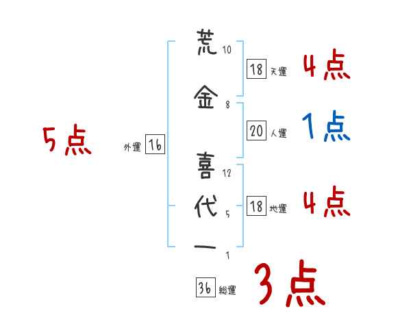 外運![]() | 荒金喜代一さんの外運は16画の5つ星!人望が厚く大きく発展する。逆転成功が見える。 生活面を象徴する運勢です。外部から受ける影響力を表し、結婚運、家庭運や職場、環境への順応性を表します。 |