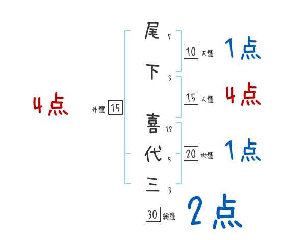 天運![]() | 尾下喜代三さんの天運は10画の1つ星!不安を感じやすい傾向。ストレスを抱えないように注意しましょう。 家系が持つ宿命的な運勢を表します。祖先から受け継いだ苗字ですので自分の力が及びません。家柄を象徴します。 |
