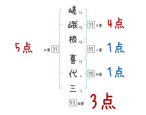 天運![]() | 嵯峨根喜代三さんの天運は33画の4つ星!権力志向でプライドが高い。勇気があり運を切り開き成功する。 家系が持つ宿命的な運勢を表します。祖先から受け継いだ苗字ですので自分の力が及びません。家柄を象徴します。 |