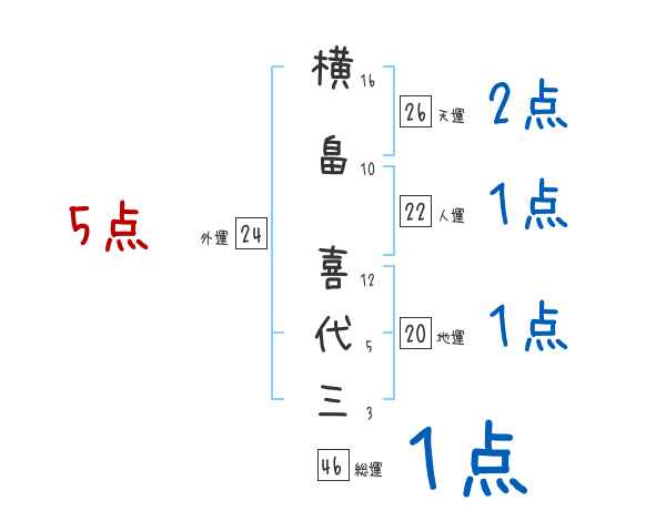 天運![]() | 横畠喜代三さんの天運は26画の2つ星!波瀾万丈かも。信頼できる人を大事にしましょう。 家系が持つ宿命的な運勢を表します。祖先から受け継いだ苗字ですので自分の力が及びません。家柄を象徴します。 |