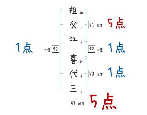 外運![]() | 祖父江喜代三さんの外運は22画の1つ星!努力することが苦手ないっぽう手先が器用。芸術性にも優れる。 生活面を象徴する運勢です。外部から受ける影響力を表し、結婚運、家庭運や職場、環境への順応性を表します。 |