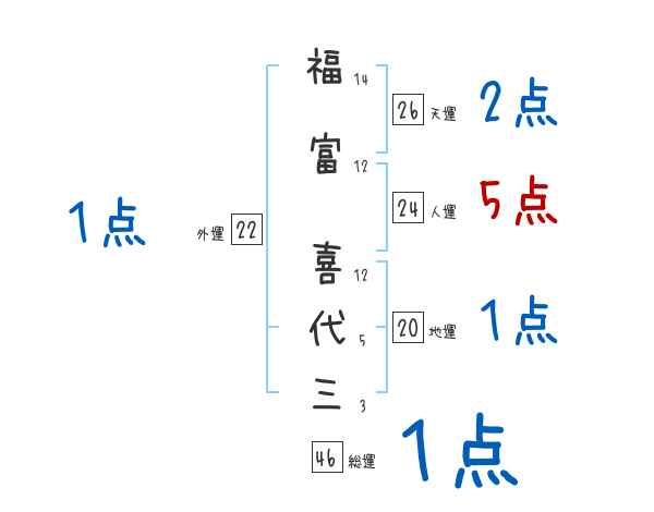 天運![]() | 福富喜代三さんの天運は26画の2つ星!波瀾万丈かも。信頼できる人を大事にしましょう。 家系が持つ宿命的な運勢を表します。祖先から受け継いだ苗字ですので自分の力が及びません。家柄を象徴します。 |