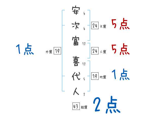 天運![]() | 安次富喜代人さんの天運は24画の5つ星!家庭運が良く順調な人生。金運にも恵まれる。 家系が持つ宿命的な運勢を表します。祖先から受け継いだ苗字ですので自分の力が及びません。家柄を象徴します。 |