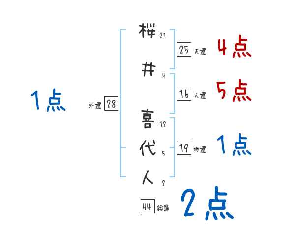 総運![]() | 桜井喜代人さんの総運は44画の2つ星!誠実で慎重な性格。物事を考えすぎないように注意しましょう。 あなたの人生を表す1番重要な運勢です。生涯を通じて影響する総合運となり、主に50歳以降の晩年期に影響を及ぼします。 |