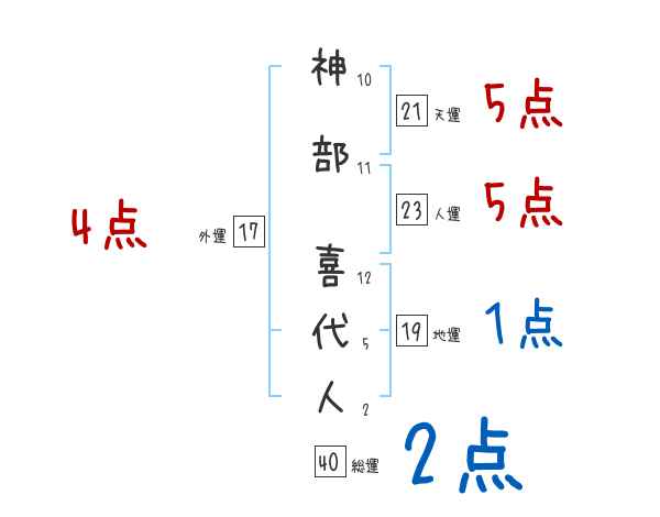 外運![]() | 神部喜代人さんの外運は17画の4つ星!積極的な行動力。地位を気づき財産を手に入れる。純粋な心と直感力。 生活面を象徴する運勢です。外部から受ける影響力を表し、結婚運、家庭運や職場、環境への順応性を表します。 |