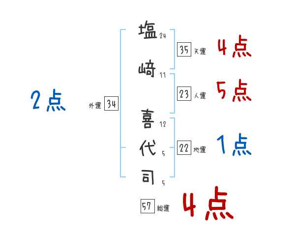 外運![]() | 塩﨑喜代司さんの外運は34画の2つ星!独創性に優れるが、自尊心が強く災難に注意しましょう。 生活面を象徴する運勢です。外部から受ける影響力を表し、結婚運、家庭運や職場、環境への順応性を表します。 |