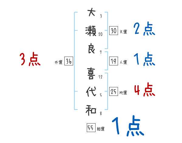 外運![]() | 大瀬良喜代和さんの外運は36画の3つ星!先見性が豊かです。多少神経質で苦労することも。 生活面を象徴する運勢です。外部から受ける影響力を表し、結婚運、家庭運や職場、環境への順応性を表します。 |