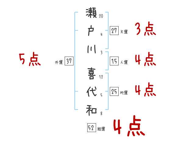 外運![]() | 瀬戸川喜代和さんの外運は37画の5つ星!努力家で順応性に優れる。現実的な考え方ができ忠実に物事をこなす。 生活面を象徴する運勢です。外部から受ける影響力を表し、結婚運、家庭運や職場、環境への順応性を表します。 |