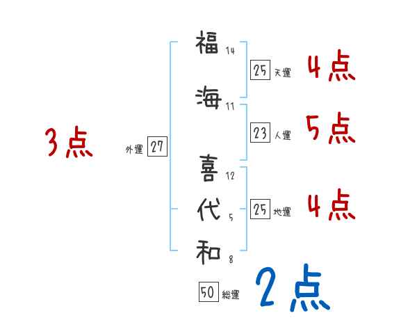 天運![]() | 福海喜代和さんの天運は25画の4つ星!個性があり才能があふれる。強運の持ち主で発展する。 家系が持つ宿命的な運勢を表します。祖先から受け継いだ苗字ですので自分の力が及びません。家柄を象徴します。 |