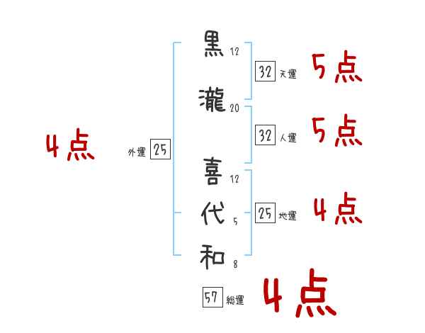 天運![]() | 黒瀧喜代和さんの天運は32画の5つ星!柔軟性があり成功する。チャンスが多く金運が良い。 家系が持つ宿命的な運勢を表します。祖先から受け継いだ苗字ですので自分の力が及びません。家柄を象徴します。 |