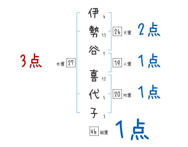 外運![]() | 伊勢谷喜代子さんの外運は27画の3つ星!頭脳明晰だが強情で摩擦が多い傾向。孤立に注意。 生活面を象徴する運勢です。外部から受ける影響力を表し、結婚運、家庭運や職場、環境への順応性を表します。 |