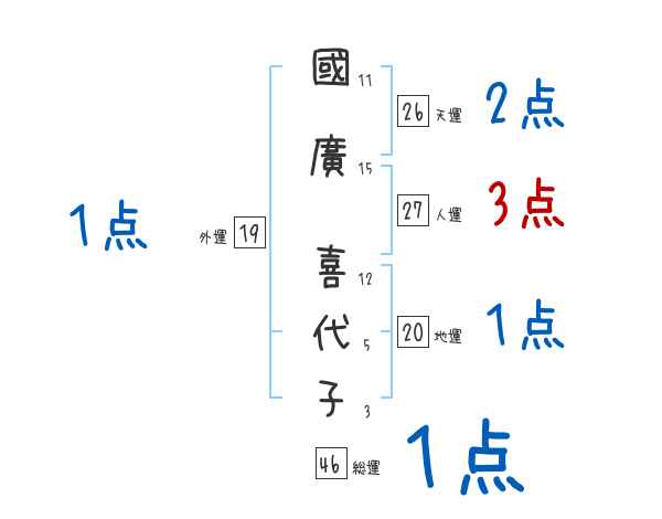 天運![]() | 國廣喜代子さんの天運は26画の2つ星!波瀾万丈かも。信頼できる人を大事にしましょう。 家系が持つ宿命的な運勢を表します。祖先から受け継いだ苗字ですので自分の力が及びません。家柄を象徴します。 |