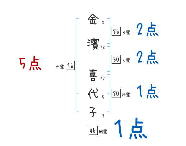 外運![]() | 金濱喜代子さんの外運は16画の5つ星!人望が厚く大きく発展する。逆転成功が見える。 生活面を象徴する運勢です。外部から受ける影響力を表し、結婚運、家庭運や職場、環境への順応性を表します。 |
