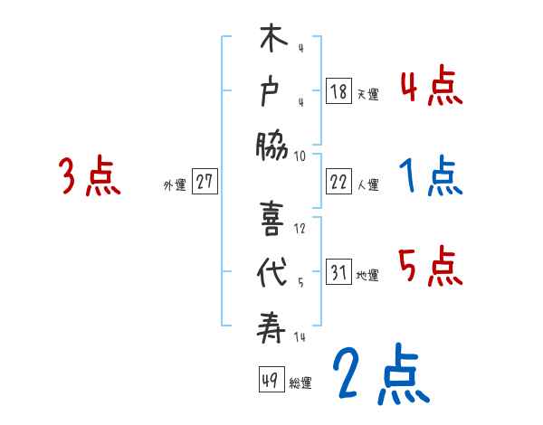 外運![]() | 木戸脇喜代寿さんの外運は27画の3つ星!頭脳明晰だが強情で摩擦が多い傾向。孤立に注意。 生活面を象徴する運勢です。外部から受ける影響力を表し、結婚運、家庭運や職場、環境への順応性を表します。 |