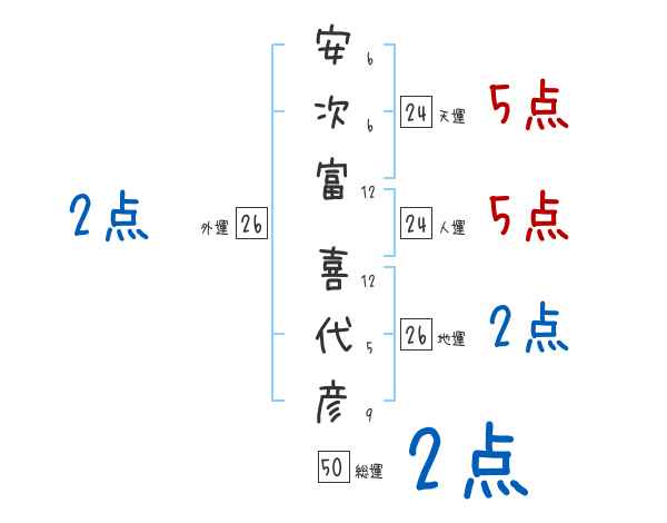外運![]() | 安次富喜代彦さんの外運は26画の2つ星!波瀾万丈かも。信頼できる人を大事にしましょう。 生活面を象徴する運勢です。外部から受ける影響力を表し、結婚運、家庭運や職場、環境への順応性を表します。 |