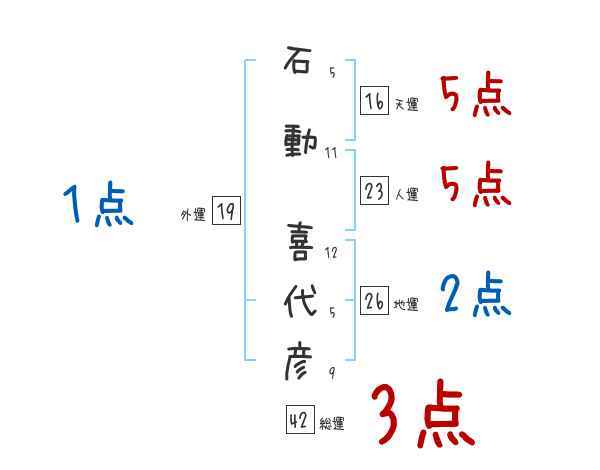 外運![]() | 石動喜代彦さんの外運は19画の1つ星!優れた才能を持ちますが、協調性が足りないことも。周りの人と協力する事を意識しましょう。 生活面を象徴する運勢です。外部から受ける影響力を表し、結婚運、家庭運や職場、環境への順応性を表します。 |