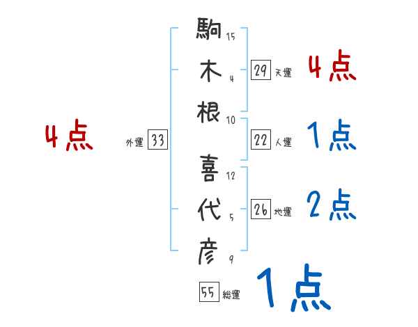 外運![]() | 駒木根喜代彦さんの外運は33画の4つ星!権力志向でプライドが高い。勇気があり運を切り開き成功する。 生活面を象徴する運勢です。外部から受ける影響力を表し、結婚運、家庭運や職場、環境への順応性を表します。 |