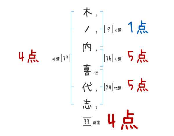外運![]() | 木ノ内喜代志さんの外運は17画の4つ星!積極的な行動力。地位を気づき財産を手に入れる。純粋な心と直感力。 生活面を象徴する運勢です。外部から受ける影響力を表し、結婚運、家庭運や職場、環境への順応性を表します。 |