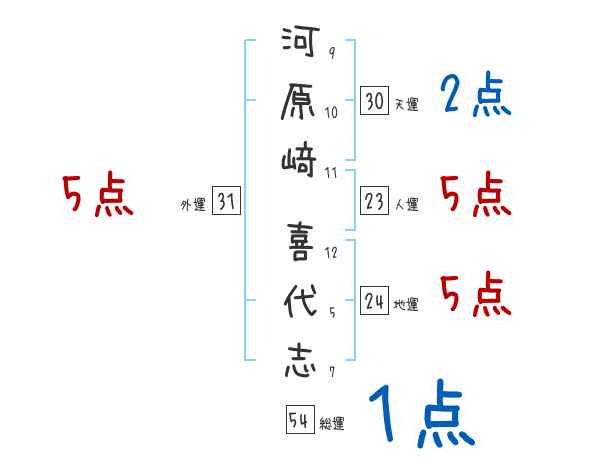 天運![]() | 河原﨑喜代志さんの天運は30画の2つ星!浮き沈みの激しさに注意しましょう。 家系が持つ宿命的な運勢を表します。祖先から受け継いだ苗字ですので自分の力が及びません。家柄を象徴します。 |