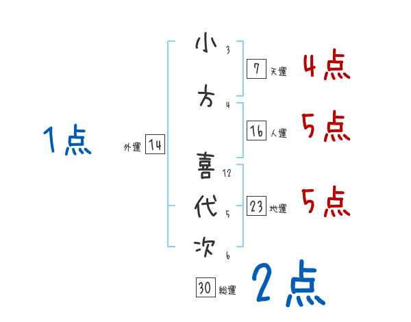外運![]() | 小方喜代次さんの外運は14画の1つ星!人に対して優しいがストレスを溜め込みがち。人間関係のトラブルを避けるよう気をつけましょう。 生活面を象徴する運勢です。外部から受ける影響力を表し、結婚運、家庭運や職場、環境への順応性を表します。 |