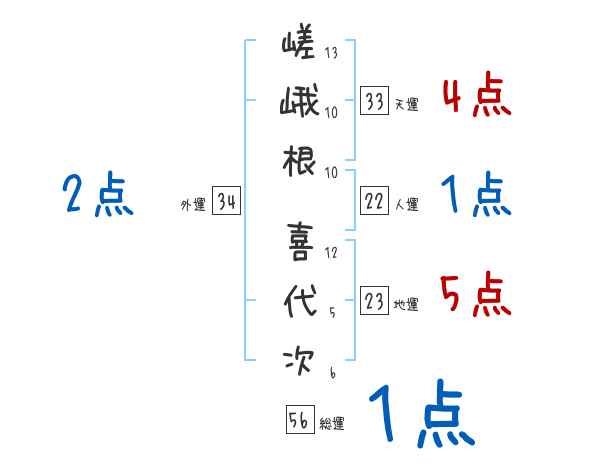 天運![]() | 嵯峨根喜代次さんの天運は33画の4つ星!権力志向でプライドが高い。勇気があり運を切り開き成功する。 家系が持つ宿命的な運勢を表します。祖先から受け継いだ苗字ですので自分の力が及びません。家柄を象徴します。 |