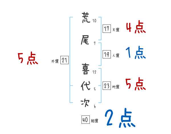 外運![]() | 荒尾喜代次さんの外運は21画の5つ星!統率力がある。独立し成功する。名誉を手に入れる。 生活面を象徴する運勢です。外部から受ける影響力を表し、結婚運、家庭運や職場、環境への順応性を表します。 |