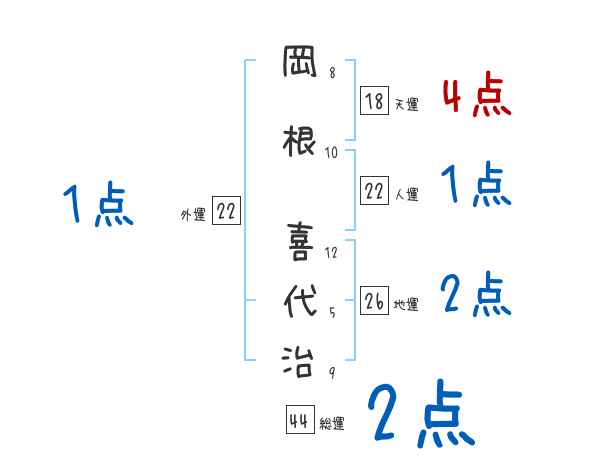 天運![]() | 岡根喜代治さんの天運は18画の4つ星!情熱的で剛気。忍耐力があり信頼される。 家系が持つ宿命的な運勢を表します。祖先から受け継いだ苗字ですので自分の力が及びません。家柄を象徴します。 |
