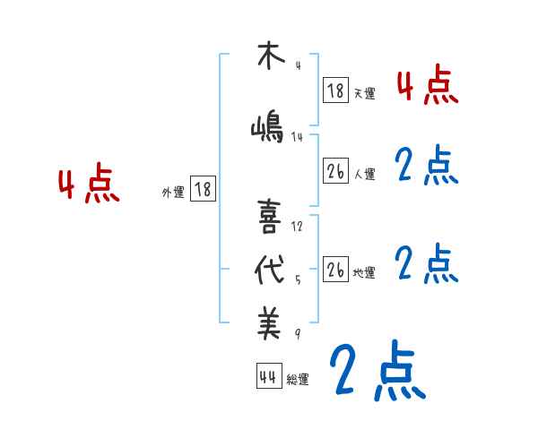 天運![]() | 木嶋喜代美さんの天運は18画の4つ星!情熱的で剛気。忍耐力があり信頼される。 家系が持つ宿命的な運勢を表します。祖先から受け継いだ苗字ですので自分の力が及びません。家柄を象徴します。 |