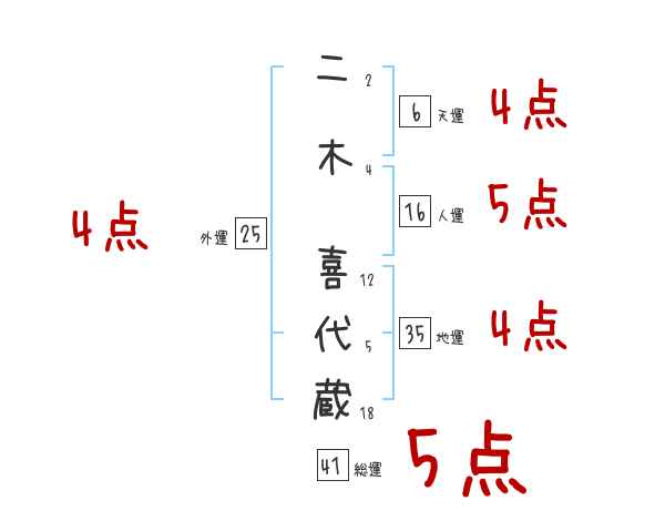 人運![]() | 二木喜代蔵さんの人運は16画の5つ星!人望が厚く大きく発展する。逆転成功が見える。 性格や才能などを表す2番目に重要な運勢です。人間関係や協調性、社会的な成功に影響します。主に20歳から50歳ぐらいまでの中年期の運勢を表します。 |