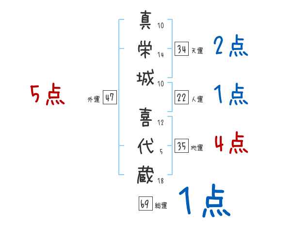 天運![]() | 真栄城喜代蔵さんの天運は34画の2つ星!独創性に優れるが、自尊心が強く災難に注意しましょう。 家系が持つ宿命的な運勢を表します。祖先から受け継いだ苗字ですので自分の力が及びません。家柄を象徴します。 |