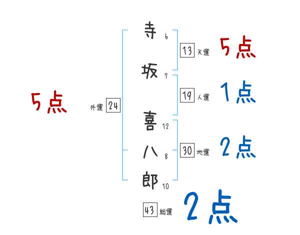 外運![]() | 寺坂喜八郎さんの外運は24画の5つ星!家庭運が良く順調な人生。金運にも恵まれる。 生活面を象徴する運勢です。外部から受ける影響力を表し、結婚運、家庭運や職場、環境への順応性を表します。 |