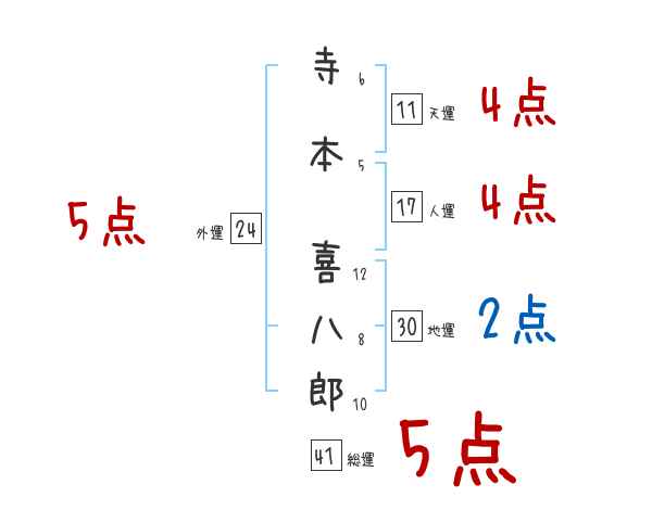 外運![]() | 寺本喜八郎さんの外運は24画の5つ星!家庭運が良く順調な人生。金運にも恵まれる。 生活面を象徴する運勢です。外部から受ける影響力を表し、結婚運、家庭運や職場、環境への順応性を表します。 |