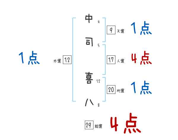 天運![]() | 中司喜八さんの天運は9画の1つ星!消極的で才能を発揮することが苦手なことも。周りの意見に耳を傾けましょう。 家系が持つ宿命的な運勢を表します。祖先から受け継いだ苗字ですので自分の力が及びません。家柄を象徴します。 |