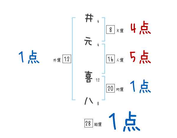 総運![]() | 井元喜八さんの総運は28画の1つ星!家庭環境に注意。スポーツで活躍できる能力があるかも。 あなたの人生を表す1番重要な運勢です。生涯を通じて影響する総合運となり、主に50歳以降の晩年期に影響を及ぼします。 |