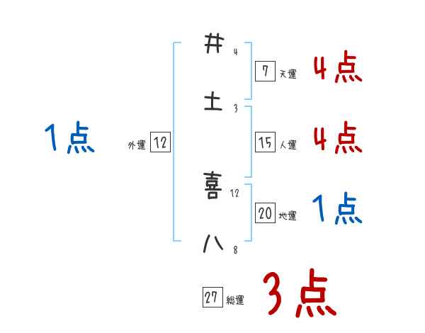 天運![]() | 井土喜八さんの天運は7画の4つ星!強い意志や信念を持ち独立心が強い。自立する。 家系が持つ宿命的な運勢を表します。祖先から受け継いだ苗字ですので自分の力が及びません。家柄を象徴します。 |