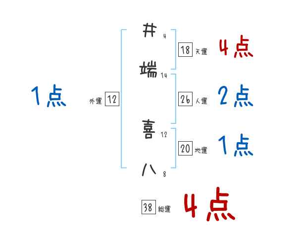 総運![]() | 井端喜八さんの総運は38画の4つ星!温厚な性格で技術的な才能を発揮する。職人的な仕事に向いている。 あなたの人生を表す1番重要な運勢です。生涯を通じて影響する総合運となり、主に50歳以降の晩年期に影響を及ぼします。 |