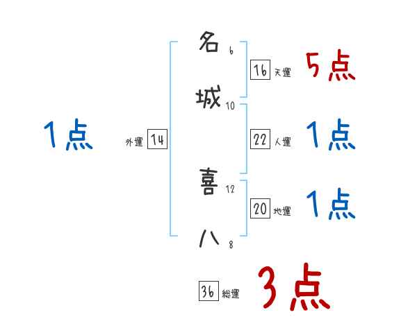 天運![]() | 名城喜八さんの天運は16画の5つ星!人望が厚く大きく発展する。逆転成功が見える。 家系が持つ宿命的な運勢を表します。祖先から受け継いだ苗字ですので自分の力が及びません。家柄を象徴します。 |