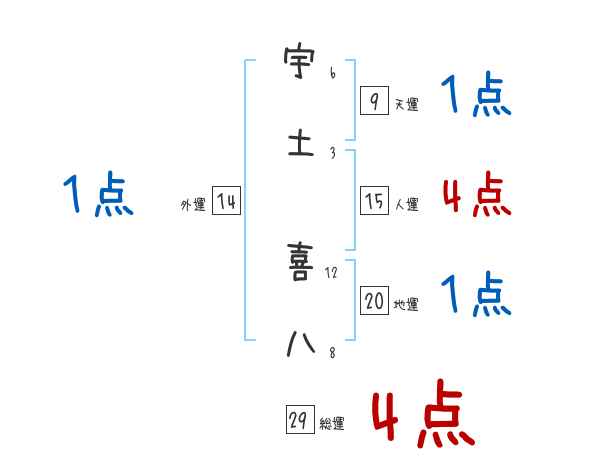 総運![]() | 宇土喜八さんの総運は29画の4つ星!完全主義で才能がある。厳格な心の持ち主。 あなたの人生を表す1番重要な運勢です。生涯を通じて影響する総合運となり、主に50歳以降の晩年期に影響を及ぼします。 |
