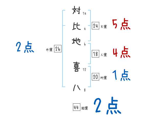総運![]() | 対比地喜八さんの総運は44画の2つ星!誠実で慎重な性格。物事を考えすぎないように注意しましょう。 あなたの人生を表す1番重要な運勢です。生涯を通じて影響する総合運となり、主に50歳以降の晩年期に影響を及ぼします。 |