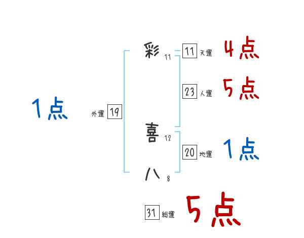 人運![]() | 彩喜八さんの人運は23画の5つ星!想像力に優れ活力がある。一代で成功し名誉を手に入れる。 性格や才能などを表す2番目に重要な運勢です。人間関係や協調性、社会的な成功に影響します。主に20歳から50歳ぐらいまでの中年期の運勢を表します。 |