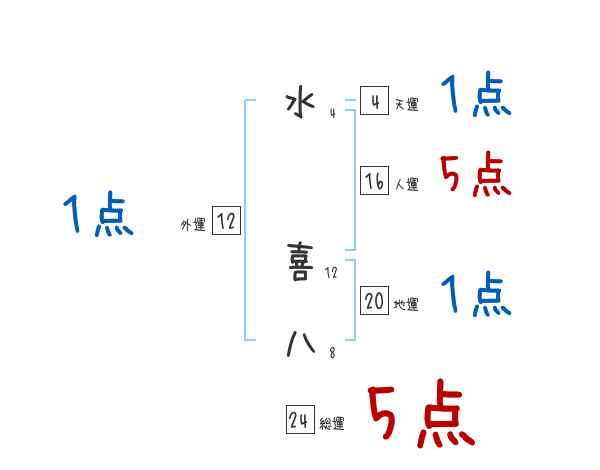 天運![]() | 水喜八さんの天運は4画の1つ星!感情が不安定で苦労するかも。周囲との協調を心掛けましょう。 家系が持つ宿命的な運勢を表します。祖先から受け継いだ苗字ですので自分の力が及びません。家柄を象徴します。 |