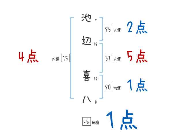 天運![]() | 池辺喜八さんの天運は26画の2つ星!波瀾万丈かも。信頼できる人を大事にしましょう。 家系が持つ宿命的な運勢を表します。祖先から受け継いだ苗字ですので自分の力が及びません。家柄を象徴します。 |
