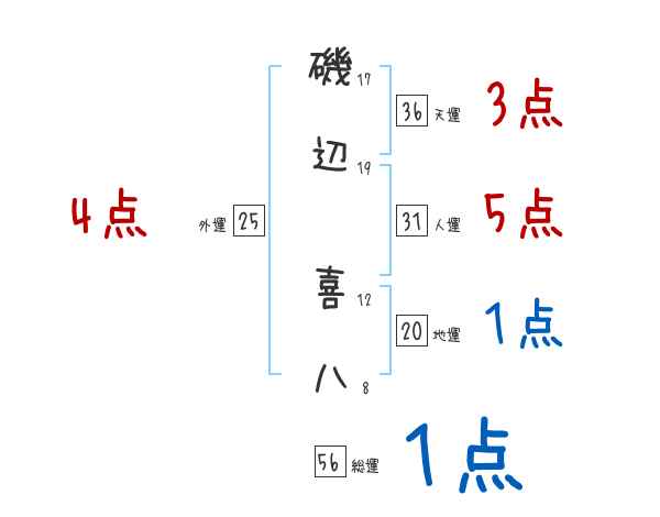 天運![]() | 磯辺喜八さんの天運は36画の3つ星!先見性が豊かです。多少神経質で苦労することも。 家系が持つ宿命的な運勢を表します。祖先から受け継いだ苗字ですので自分の力が及びません。家柄を象徴します。 |